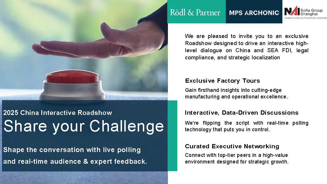 We're excited to be part of this impactful event, organized by Roedl & Partner China, MPS ARCHONIC, and NAI Sofia Group Shanghai. This exclusive gathering is designed for decision makers aiming to explore industrial innovation, legal strategies, and localization excellence in the Chinese market.